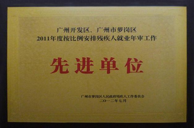 2012年7月,我司被廣州市蘿崗區(qū)人民政府殘疾人工作委員會(huì)評(píng)為2011年度按比例安排殘疾人就業(yè)先進(jìn)單位。